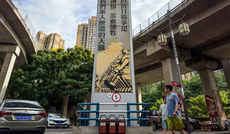 题图:游客走过位于中国重庆一处昔日战争遗址的抗日标语和图案柱。 (Photo by Cheng Xin/Getty Images)