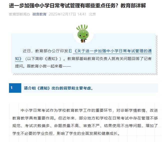2025年12月4日,教育部办公厅印发《关于进一步加强中小学日常考试管理的通知》(以下简称《通知》)。
