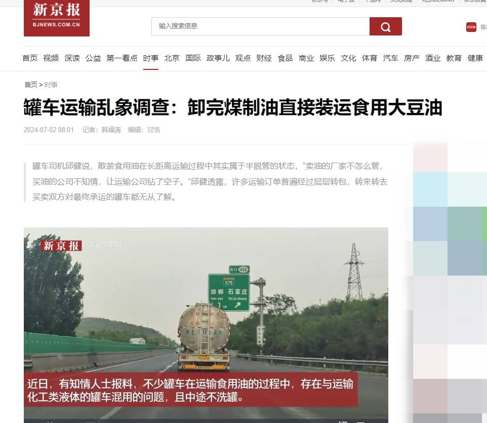 2024年7月,《新京报》发布油罐车装运食用油的调查报导。(翻摄《新京报》网站
