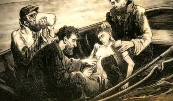四人在吃掉了救生艇上所有的食物后,已经有八天没有进食了。在漂泊19天后,杜德利船长建议抽签,谁抽到就会被杀,以拯救剩下的人。船员布鲁克斯则保持沉默。