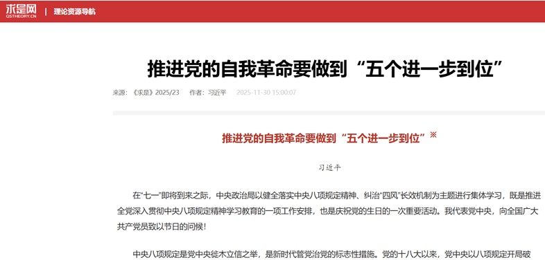 12月1日——《求是》杂志重磅刊发习近平最新署名文章,标题是《推进党的自我革命要做到“五个进一步到位”》,无论从行文风格还是背后的动机,都如同毛泽东当年发表的政治动员令“炮打司令部”。文章以雷霆万钧之势向全党发出最严厉的动员令:必须以“自我革命”的刀刃向内,彻底清除一切侵蚀党的健康肌体的病毒,否则党将不党、国将不国!文章直指五个生死攸关的战场:思想上要再来一次“灵魂深处闹革命”,坚决把一切不纯洁思想连根拔除;忠诚上要回归“绝对忠诚、绝对纯洁、绝对可靠”的习式标准,容不得半点动摇;权力运行要彻底关进“笼子,任何滥用权力的官员(不包括他自己)必须毫不留情连根拔起;反腐永远在路上,要以“宜将剩勇追穷寇”的气势保持持续高压,永不收兵、永不收手;问责要恢复“狠抓狠斗”的铁腕,失责必问、问责必严,让每一个党员干部如芒在背!