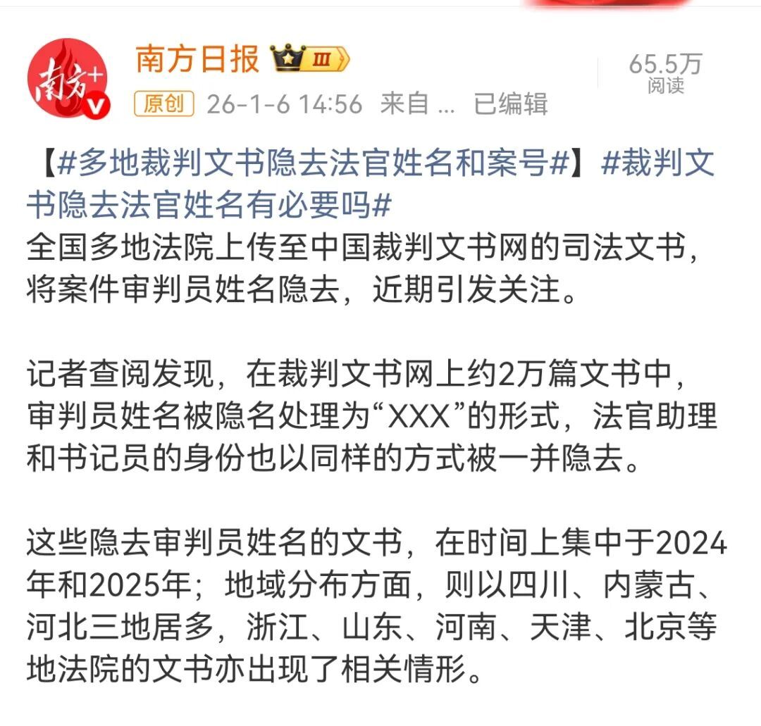 南方日报今天发文,说的是多地法院上传中国裁判文书网的文书,除了隐去当事人的身份信息,还隐去了经办法官,法官助理书记员以及案号等信息。